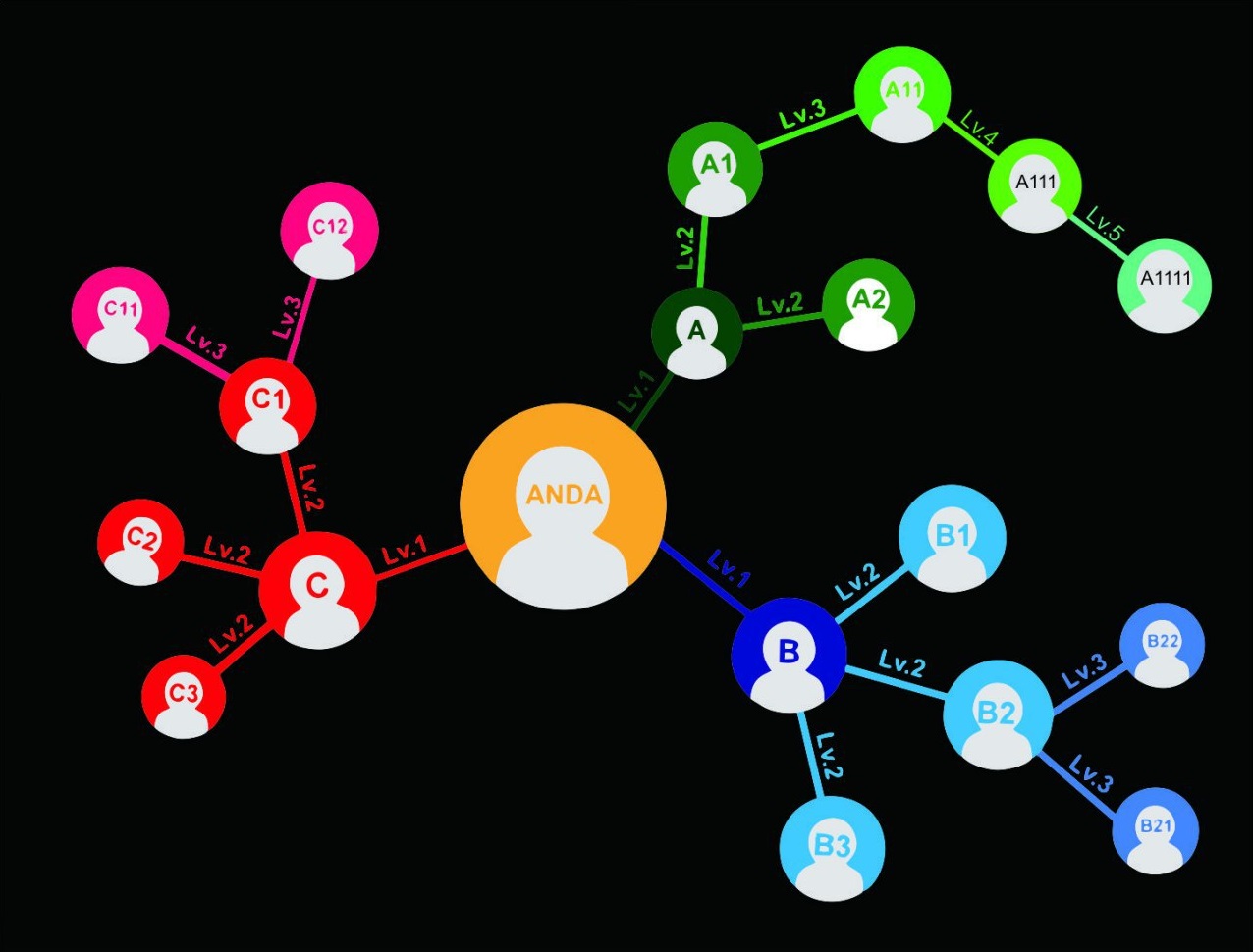 Level 3 : A1 mengajak 1 orang bergabung (selanjutnya dikenal sebagai A11), B2 mengajak 2 orang bergabung (selanjutnya dikenal sebagai B21 dan B22) dan C1 mengajak 2 orang bergabung (selanjutnya dikenal C11 dan C12).